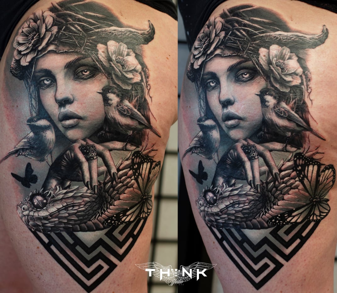Je suis Mad , née le 22 aout 1988 , après l’obtention de mon diplôme dans le sport j’ai pu exercer quelques années avant de m’orienter vers le tatouage . j’ai toujours été inconsciemment lié à la création. Que ce soit musicalement , cinématographiquement , prose , dessin etc…. ce qui m’a d’avantage attiré avec le tattoo , c’est l’aspect spirituel que je peux partager avec mon prochain au travers la symbolique que cela peut dégager. Le corps est un support vivant sacré à mes yeux. J’aime me dire que mes créations que vous êtes prêt à porter une vie entière, sur votre chaire sont l’armure de l’âme. Ils ne parent ni les coups ni les flèches , mais ils contribuent à se protéger de la violence d’un deuil , d’une trahison ou autres.